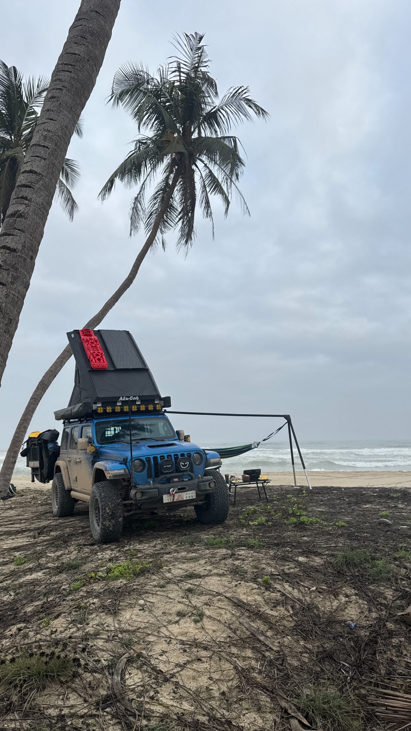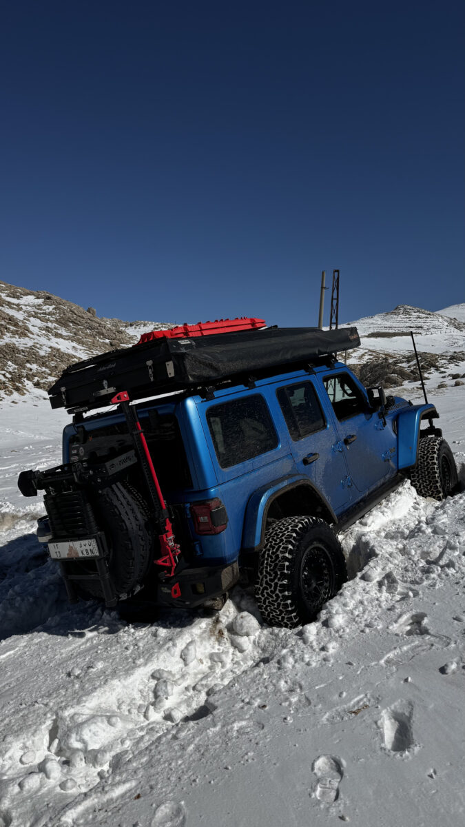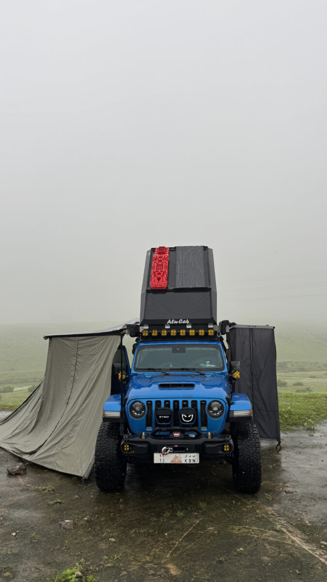 To facilitate Mohammed’s overland journey through the Middle East, his Jeep is kitted with Alu-Cab gear designed for self-sufficiency and comfort. This includes the Gen 3-R Rooftop Tent complete with the Gen 3-R Backrest and Interior Drop Down Table, 270° Shadow Awning and Shower Cube. This gear transforms the Jeep from a mode of transport into a complete, mobile basecamp.