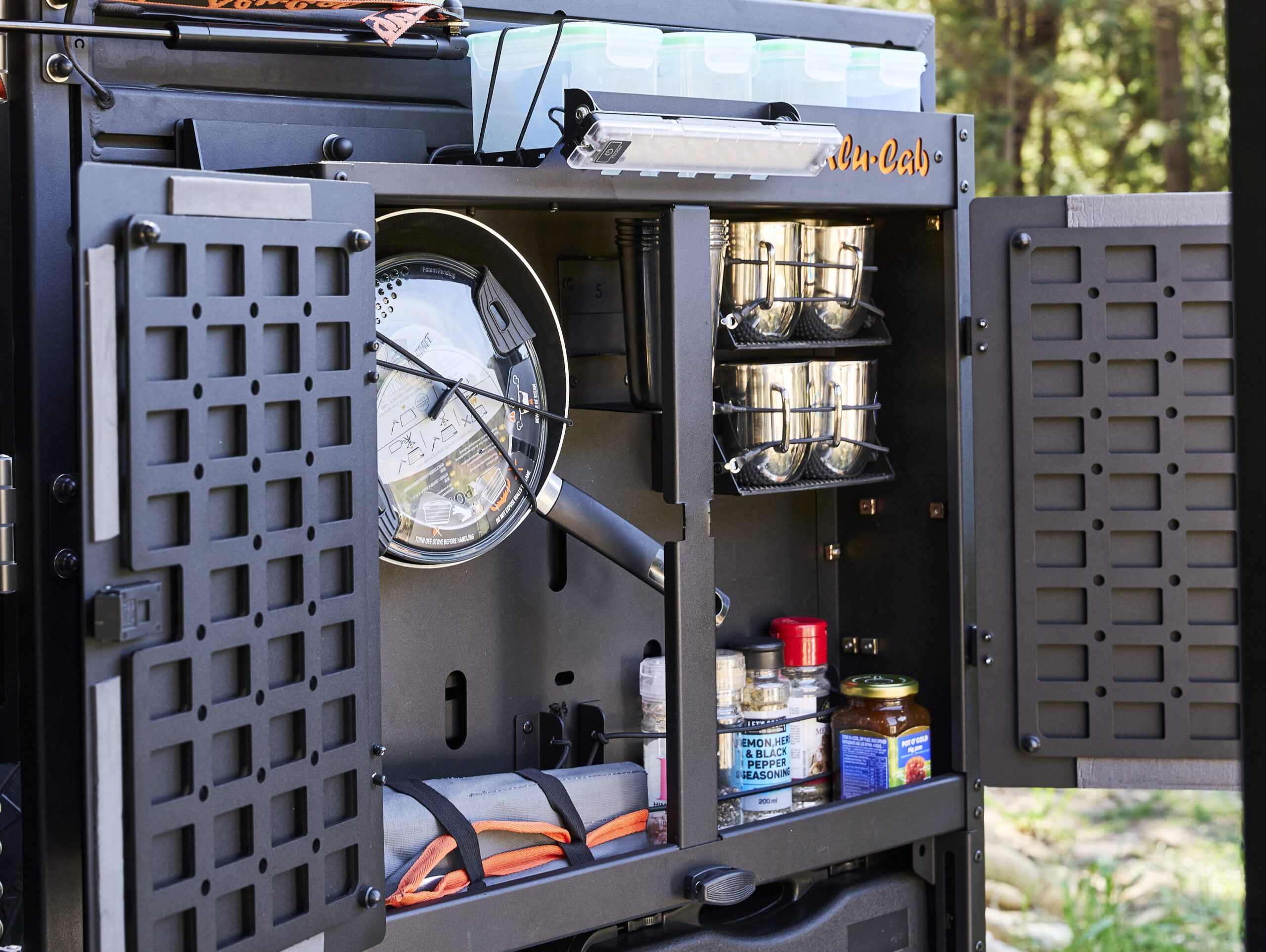Small footprint, big function. Our compact ModCAP Rear Door Kitchen delivers a sleek design, generous prep space and smart storage – perfect for life on the move. Compatible with all ModCAP and Canopy Camper models, it comes fully loaded with cookware, utensils, a spice rack and a pre-installed bamboo cutting board.